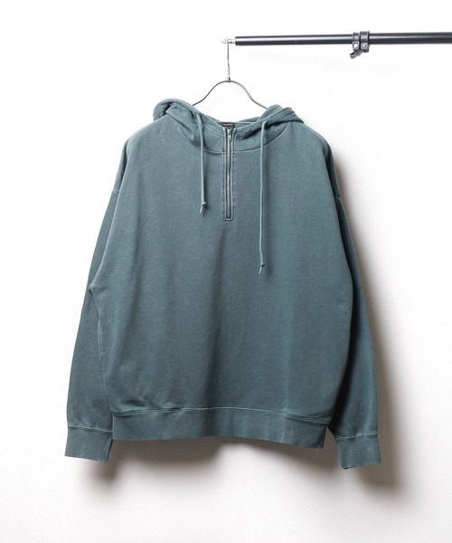 ピグメント加工を施し、古着のようなヴィンテージ感のある裏毛素材を使用したハーフジップパーカー。 生地を縫製して製品の状態になってから染色する製品染め仕上げ。 色落ちしたような風合いが特徴で、こなれた雰囲気がでるのが特徴。 洗うたび色が落ち着き、エイジングを楽しめます。 ビッグシルエットで男女ユニセックスでお使い頂けます。 シンプルだからこそ、どんなコーデにも合わせやすく レイヤードにも最適なアイテムです。