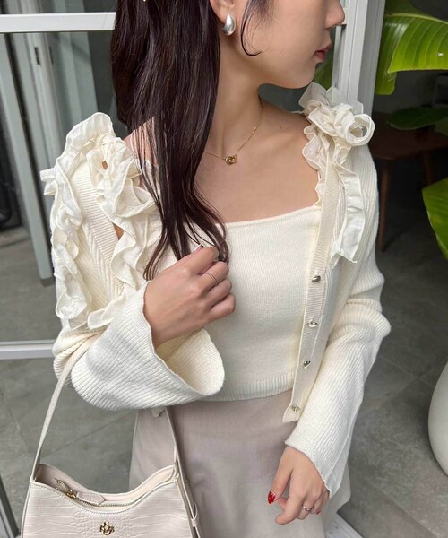 ~NICECLAUP 2024 early spring Collection~肩のフリル感がフェミニンな印象にしてくれる、ニットキャミ。伸び感もあり着心地も◎少し短めな丈感で、トレンドの肌見せコーデにピッタリ!夏は、1枚でも旬な着こなしが完成するアイテム。肩のリボンがアクセントになるので、シンプルなカーデのインナーにピタリです。■オススメスタイリング丈感が短めなトップスなので、ローウエストデニムで合わせて、肌見せルックもオススメ!レイヤードなら、カーデに入れたり、オフショルニットやキャミワンピースの下にレイヤードさせると、いつもと違ったコーデになれてオススメです。-------------裏地: なし伸縮性:あり生地の厚さ:普通生地の重さ:普通洗濯 :手洗い-------------※サンプルでの撮影のため、実際のものと仕様や色が異なる場合があります。※室内、室外での撮影のため実際より明るく映っていたり、暗く映っていたりする場合がございます。※品質表示を必ずご確認下さい。▼お気に入り登録のおすすめ【気になるアイテムを登録】ハートをクリックしてお気に入りに登録すると完売カラーの再入荷やラスト1点の通知、セールの通知を受けとることができます。【ブランドを登録】新作入荷や再入荷、セール通知など、いち早くブランドの情報を受けとることができます。是非ご利用下さい♪2024SS