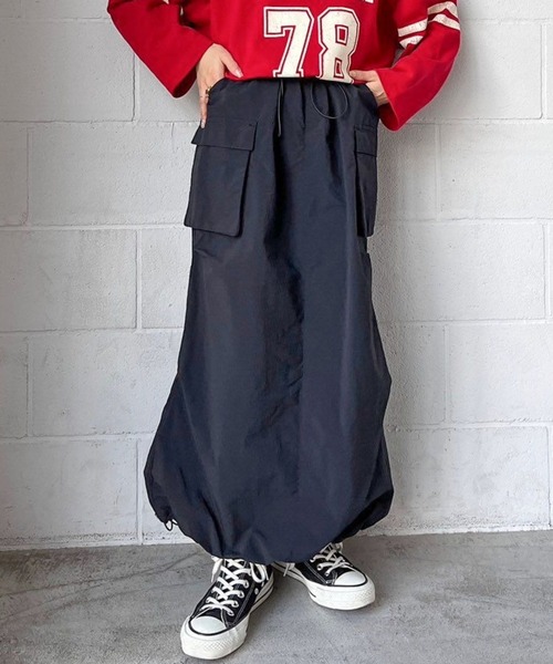 ■素材■太さの異なるナイロン糸を使用した素材を使用。しっかりとした生地感で防水性もあり滑らかかつ表情のある素材になっています。程良いカジュアルさなので普段カジュアルなスタイリングが苦手な方でも取り入れやすくなっています。■デザイン■立体的なポケットデザインがポイントのカーゴスカート。サイドにはタックも入れてより立体的なシルエットに仕上げました。裾のドロストコードを絞ることでまた違ったシルエットを楽しむことができます。適度にゆとりあるサイズ感、裾に入れたスリットで足さばきも良く楽に着ていただけるアイテムです。
