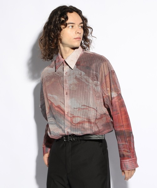 ーーー ランドスケープ柄のデザインシャツ登場 ーーー point □ディレクションテーマのランドスケープ柄を使用したシャツ。 □風景画をアートグラフィックで表現した抽象的なデザインに。 □ボディには程よく透け感のあるメッシュ生地を使用し両性的な雰囲気を演出しています。
