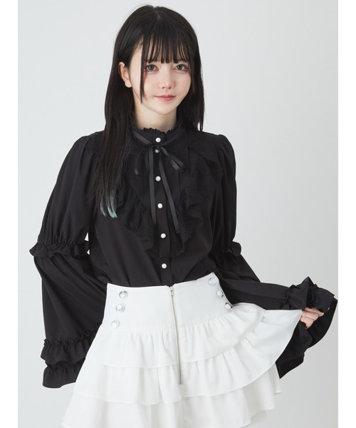 タック&フリル姫袖で、ゴシック可愛い雰囲気を醸し出すブラウスの登場です♪ フリルの姫袖デザインが、ほどこされて、可愛らしく、スタイリングの好アクセントになります。スタンドカラーやタックが、あしらわれて、クラス感も十分◎ 細リボンが、付属して、上品ながら甘辛テイストを演出してくれる一着です★ リボン取り外し可