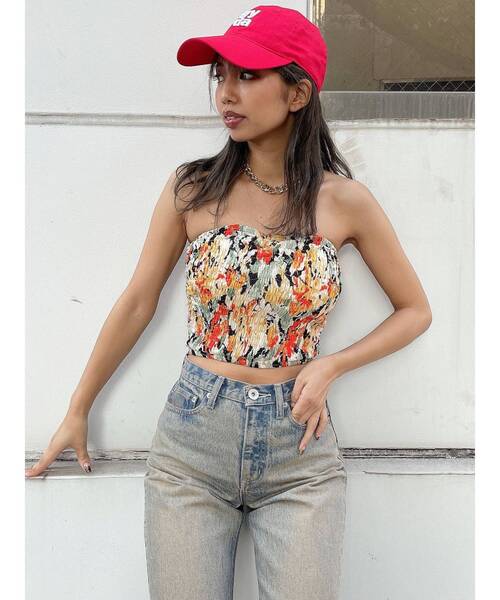 商品コメント:フラワー柄が印象的なビスチェです。ニュアンス柄のような花柄なので、カジュアルでも綺麗目でも、様々なスタイリングに合わせやすく、甘い印象になり過ぎません。パット入りなので、一枚で着用出来るのもポイントで、スタイリッシュな雰囲気になります。 コーデ:無地シャツを羽織ったり、巻いていただくのがヘルシーな印象になりオススメです。ベアトップなので、ボトムを選ばず、ハイウエスト ASID WASHワイドデニムパンツなどと合わせていただくと、甘辛い印象に仕上がって可愛いです。