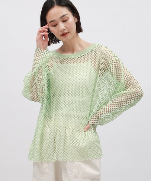 メッシュデザインのトップス。透け感があり、程よい肌見せのレイヤードが楽しめる1枚です。身幅にゆとりがあるのでロンTとのレイヤードも〇合わせるインナーによって印象も変わるアイテムです。