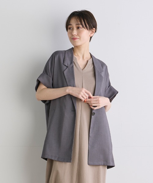 ハンサムな中にも女性らしさが感じられるデザインにこだわった、今季トレンドのハーフスリーブジャケット。暑い季節に涼しく心地良い、リネンライクな風合いのリニーブッチャー生地で仕立てました。平織りとななこ織りを組み合わせることで、麻のような手触りと不規則な凹凸があり、通気性・吸水速乾性が高いことが特徴です。ウエストを絞らないボクシーなシルエットにすることで、着やすさとこなれ感を出せる1着です。パンツ、スカートに合わせた単品使いはもちろん、同素材のワンピースとのセットアップスタイリングもおすすめです。 ・ポケットあり・水洗い可 ▼セットアップ対応 同素材のワンピース品番:7142121511 ■サンプル撮影商品■ こちらの商品はサンプルでの撮影となっております。実際の商品とは、サイズや色味、素材、デザイン等の仕様が若干変更になる場合がございます。