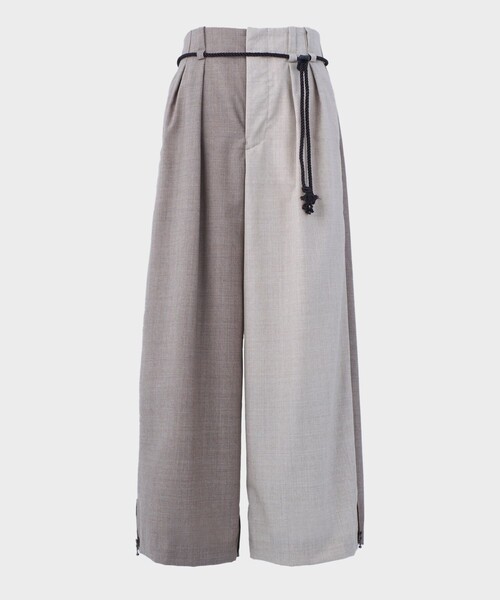 【素材】60/2糸を使用した平織り物(トロピカルウール)。通気性があり薄手でありながらハリ感のある仕上がりです。愛知県一宮産の上質な生地です。透け感:なし伸縮性:なし裏地:あり洗濯:ドライクリーニング推奨【デザイン】3種類のトップ糸を使用しそれぞれを生地に織り上げた上で、パーツごとに色を変え同系色のグラデーションを表現しました。ウエストにタックを二つ施した袴のようなワイドシルエットです。裾に付くジップで絞り、シルエットの調整が可能です。ウエストの太めのドローコードもポイントとなり、縛って着用できます。【メーカー品番】6E124-77【ブランド】ETHOSENS「視点を変えることで、ごく当たり前で日常に存在する些細な物事が魅力的な作品として変化する。」エトセンス(ETHOSENS)はファッションデザイナー、橋本唯(Yui Hashimoto)が展開するブランド。未来のスタンダードになり得る革新的な表現を目指し、わずかでも世の中に新しい価値観をもたらすことができような、本質的なクリエーションを追求する。エトセンス(ETHOSENS)のデザインは、クラッシカルで伝統的なスタイル、ディテールをベースにしつつ、日常の中に見い出される「ごくあたり前のこと」にフォーカスし、疑問視、視点を変え、それを落とし込むことで作品に変化を与えている点が特徴。素材、縫製、カッティングと非常にしっかりとしたつくりになっている。※店舗と在庫を共有しておりますので、受注確認メールが届いてもご注文のタイミングによりましては売り切れになる可能性がございますので、予めご了承ください。※商品の色味につきまして、撮影環境、お客様のお使いのPCのモニター環境により実際のカラーと画像の色味が違って見える場合が御座います。予めご了承の上、ご注文下さい。--------------------------------------------【お買い物をよりお楽しみいただく為に】▼商品のお気に入り登録をおすすめします。「カートに入れる」横の?をタップまたはクリックしてください。完売カラーの再入荷や、ラスト1点の通知、セールの通知を受ける事ができます。▼ブランドのお気に入り登録も併せておすすめです。新作アイテムの入荷をお知らせします。