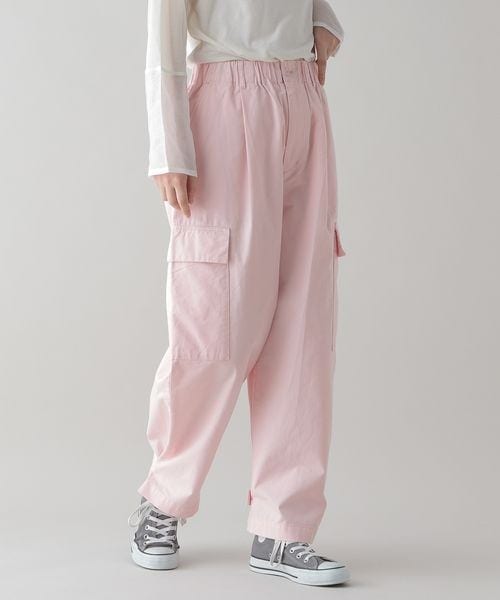 ーーー ハリのあるコットン素材のチノカーゴパンツ。 カーゴデザインが今年らしく、トレンド感のある着こなしをお楽しみいただけます。 ウエストは総ゴムでゆったりとしていてイージーに穿けるもの嬉しいポイント。 裾にはベルトが付いているので絞ってシルエットの変化も楽します。 ーーー カジュアルな雰囲気なので、あえてフェミニンやナチュラルなトップスとの 甘辛MIXコーデもおすすめです。