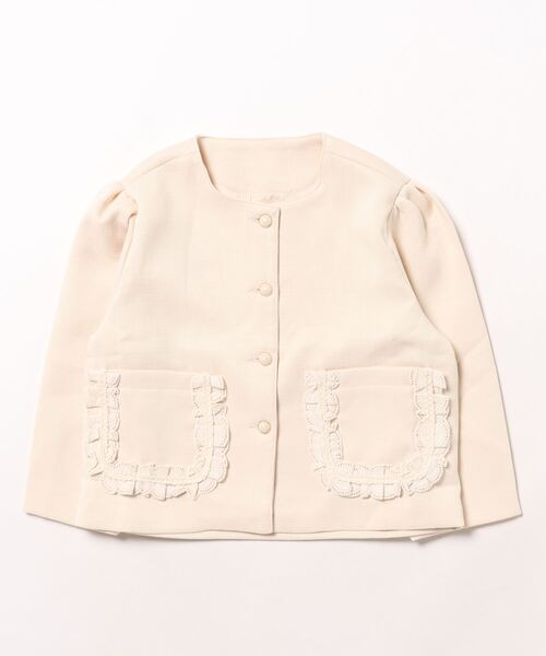 レースが施されたポケットデザインにパフスリーブデザインの長袖ジャケット。 サッと羽織るだけで旬のトレンドコーデの完成!1枚でオシャレ感がぐっと増すアイテムです。 ※ご注意※ 掲載画像の商品の色味は、屋外や屋内の光の照射や角度により実物と色味が異なって見える場合がございます。