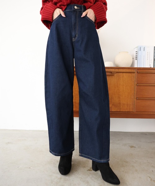 《立体的なバレルシルエットを再現したモードなデニムパンツ》 ■デザイン サイドに入ったダーツによる、膝上から外側にかけての立体的なシルエットがポイント。 ワイドシルエットで、ゆるっとした着用感が着やすくこなれ感のある1枚。 ハイウエストデザインでメリハリのあるシルエットに。 ■素材 ハリ感のあるデニム素材 ■スタイリング ボリュームのあるパンツなのでコンパクトなトップスとの相性◎ 足元はスニーカーやローファーを履いて軽やかな印象に♪ Tシャツやブラウスなど様々なトップスと合わせやすく、デイリーに活躍するアイテムです。 ------------------------------ 【スタッフが着用しました!】 身長:153cm 普段着用サイズ:S~Mサイズ 今回着用サイズ:FREEサイズ ・着用感 ちょうどいいサイズ感で、ほどよくゆるく着こなせました。 ウエストゴムで楽な履き心地。 他にはないおしゃれなデザインで海外ぽい雰囲気で履けそうです。 ------------------------------------------------ 身長:164cm 普段着用サイズ:M~Lサイズ 今回着用サイズ:FREEサイズ ・着用感 ちょうどいい長さでどんな靴でもずらなさそうです。 ウエストゴムで楽でした。 体型カバーしつつおしゃれに履けそうです。 ------------------------------------------------