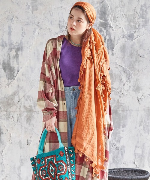 インド綿&シルク混素材ならではの上質でさらりとした柔らかな肌ざわり。四辺にタッセルが付いたフォークロア感あふれるデザイン。首元に巻くのはもちろん、肩から掛けて羽織ったり、頭に巻いてターバンにするのもおすすめな大判ストールです。※こちらの商品は1点1点職人による手作りとなります。その為、形や色合いなど若干異なる場合がございます。あらかじめご了承ください。※屋外での撮影画像は、光の当たり具合で色味・カラーが違って見える場合がございます。商品のカラーは、スタジオ撮影の画像をご参照ください。Amina Collection Co.,LTD.