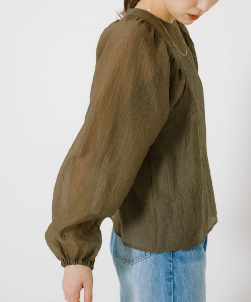 【トレンドライクなスタイルが完成するギャザーブラウス】楊柳素材を使用したシアーブラウスは、シボ感のある生地がコーディネートに表情を与え、シンプルなボトムス合わせでも着映えするアイテム。たっぷりとギャザーの入ったスリーブがポイントで、少し内側に入れた前後の切り替えが程良くボリュームを抑え華奢見えを叶えます。透け感が気になる場合は、同色系のインナーを合わせるとヘルシーな女性らしい印象に。デイリー使いはもちろん、合わせるアイテム次第でお仕事などのオンスタイルにも活躍します。POINT・トレンドのシアー素材・女性らしいボリュームスリーブ・オンオフ兼用デザインCOORDINATEデニムとカジュアルに、ワイドパンツやスカートとキレイめに◎【2024 Spring/Summer】【24SS】※この商品は、デザイン上モノフィラメントを使用しております。特にお肌の弱い方は下に1枚着用することをおすすめします。※特殊なシワ加工を施しているため、一点一点にサイズや外観の違いがあります。商品の特徴としてご理解ください。※その他お取り扱いに関しましては、商品に付属のアテンションタグをご覧ください。※商品画像は、光の当たり具合やパソコンなどの閲覧環境により、実際の色味と異なって見える場合がございます。予めご了承ください。※商品の色味の目安は、商品単体の画像をご参照ください。▼お気に入り登録のおすすめ▼お気に入り登録商品は、マイページにて現在の価格情報や在庫状況の確認が可能です。お買い物リストの管理に是非ご利用ください。素材感透け感 : ややあり伸縮性 : なし裏地 : なし光沢 : なしポケット : なし