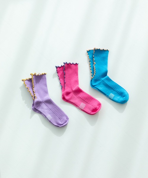 履き口とかかとにバイカラーのメローフリルを施したトレンド感たっぷりのソックス。 春夏コーデに取り入れたい、POPな印象の3色をセットにしました。 足裏は滑り止め付きでアクティブなお子様にもピッタリ。 【スタイリング】 スニーカーにはもちろん、サンダルとも相性の良いアイテム。 そのまま履くのはもちろん、敢えてクシュッとさせても可愛く履いていただけます。 かかとのメローで後ろ姿もおしゃれに◎ 【ポケット】 なし 【伸縮性】 あり 【透け感】 透けない 【クリーニング】 洗濯機洗い可(ネット使用) 【裏地】 なし モニター・環境等により実際の商品と色味が多少異なって表示される場合がございます。 また、生産時期により色味が若干異なる場合がございます。予めご了承ください。