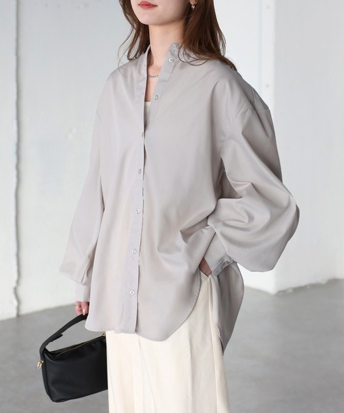 【Riberry バルーン袖スタンドカラーブラウス】 \1枚着でも、羽織でも、インナーでも/ マルチに使える!使い勝手抜群なスタンドカラーブラウス♪ ■Styling 1着あれば使い勝手抜群な、スタンドカラーブラウスが登場しました。 やや大きめのサイズ感なので1枚で着るのはもちろん、羽織やレイヤードスタイルにも使いやすいアイテムです。 デニムやチノパン、Tシャツの上に羽織ってラフなスタイリングにしたり、スラックスやタイトスカートできれいめなスタイリングも◎ カジュアルからきれいめまで幅広いコーデに合わせやすいアイテムです。 ベーシックな形ながらもふわっと膨らむ袖がこなれ感を演出してくれます。 シンプルで合わせやすく、お仕事にもおすすめなデイリー使いにぴったりな1着です。 ■Detail 後ろが長めでお尻まで隠れる着丈。やや大きめなサイズ感で身幅もゆるっとしているので体型カバーにもおすすめです。 スタンドカラーで首元もすっきりして見えるデザインです。 ふわっと膨らむ袖がアクセント。 ベーシックなデザインながら裾部分はラウンドカットでメンズライクになりすぎない仕様。 ■Material ポリエステルと綿の混紡素材で、ハリ感があり比較的シワになりにくい素材。 耐久性に優れており、着心地も◎快適に着用いただけます。 ▽生地感 透け感:あり 〇〇●〇〇 なし(白系,薄い色ややあり) 生地の厚さ:厚い 〇〇●〇〇 薄い 裏地:なし 伸縮性:なし ※この素材は摩擦(特に湿った状態での摩擦)や雨、汗でぬれた際には他の衣料等に色が移ることがございますのでご注意ください。 ※お肌のデリケートな方は刺激を感じる場合がございます。 ※詳しいお手入れ方法は商品タグをご参照ください。 【Information】 ◆《お気に入り登録》がオススメ◆ ・「商品のお気に入り登録」で再入荷通知や、ラストの通知、セール通知も受け取ることが出来ます。 ・「ブランドのお気に入り登録」で新商品や再入荷など、お得な情報を受け取ることが出来ます ※撮影時のライティング、ご覧になっているモニター・PC環境により、実際の商品と色味が異なって見える場合がございます。予めご了承をお願い致します。