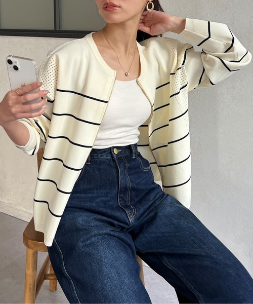 春の主役アイテム!軽い着心地が魅力のニットカーディガン ■point 大人っぽくシンプルなカーディガンに透かし目模様のアイレットを 施し、可愛らしい印象に。ノーカラーですっきりと着こなしていただけます。 軽い着心地ながらしっかりとした生地感で更にゴールドジップを使用し 上品さをプラスしました。 ■coordinate メイン使いはもちろん、羽織りとしても大活躍。 タンクトップやキャミワンピースなどにさらっと合わせるのもおすすめ。 幅広いアイテムとマッチしこれからの季節に重宝する一枚です。 ■fabric ポリエステル100% -------------------------------------------------- 裏地:なし 光沢感:なし 伸縮性:あり 生地の厚さ:普通 洗濯方法:洗濯弱 -------------------------------------------------- ※商品画像は着用イメージです。 光や角度により、実物と色味が異なる場合がございます。また表示のサイズ感も実物とは若干異なる場合もございますので、ご了承ください。 ※着用、お取り扱いの際は、商品についている品質表示とアテンションタグを必ずご確認ください。 -------------------------------------------------- ♡をクリックでお得な情報をお知らせいたします。 <商品お気に入り登録> お気に入りアイテムのお値下げ・再入荷・在庫ラスト1点など通知を受けることができます。 <ブランドお気に入り登録> Chez toiの新商品・再入荷・SALE・クーポン配布などお得な情報を受けることができます。 -------------------------------------------------- Cheztoi/シェトワ フランス語で「あなたの家」という意味。 自分にまっすぐでそしてしなやかに生きる女性に向けたブランドです。