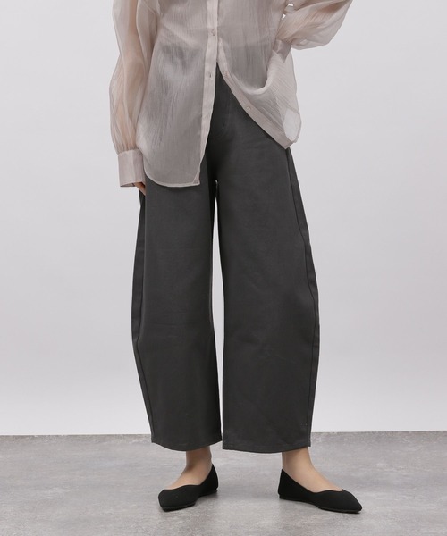 裾に向かって細くなる綺麗なカーブシルエットが特徴的なパンツ。程よく丸みのある女性らしい穿きやすいシルエットなので、穿くだけでスタイルUPが叶う1本です。ハイウエストデザインで腰回りはスッキリも見え、後ポケットも少し高めの位置にデザインされているのでヒップアップ効果も〇ワイドデザインながらも立体感のあるシルエットが楽しめる1点です。【素材】程よく凹凸がある厚みのデニムに近い質感。【スタイリング】ボリュームのあるデザインなのでコンパクトなトップスとの相性が〇ハイウエストデザインなのでトップスインスタイルもおすすめです。※デザイン上製品洗い加工を施していない商品のため、洗濯後の縮みが起きやすい商品となります