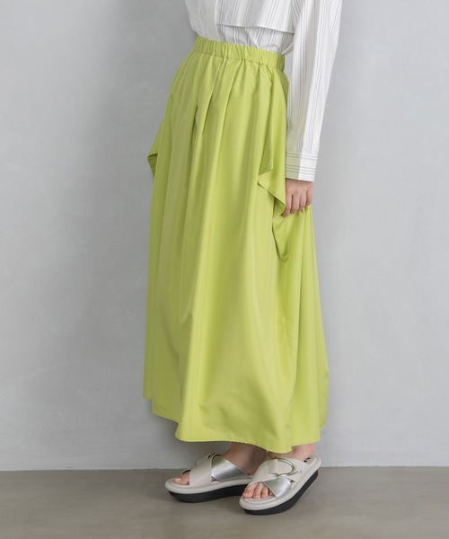 ■2024 SPRING / SUMMER collection■ カラフルなカラー展開のスカート ドレープ×コクーンシルエット 軽量感と穿き心地がよい素材感にもこだわりました。 印象的な脇のドレープデザインがポイントで、全体的にコクーンシルエットになっています。 脇側のコクーンシルエットが立ちやすいよう、ボックスタックを入れています。 ウエストにはタックが複数入っているので、腰まわりをさりげなくカバーできるのも嬉しいポイントです。 ALLゴム仕様のウエストで、ノンストレスな着心地です。 トレンドの短い丈のトップスとの相性が良く、着回し力もあり、スニーカーやサンダルといった足元を選ばないのもおすすめポイントです。 【DESIGN】 ■ウエストはゴム+ギャザー+タック仕様 ■両サイドボックスタックデザイン ■長めの丈感でコクーンシルエット ■軽量で動きのあるデザイン 【MATERIAL】 表地柔らかいタフタ素材を使用 ・ドレープがきれいに見える薄めで柔らかい風合 裏地高級ニット裏地を使用 ・伸縮性があり柔らかく滑らかなタッチ ・夏まで着れるドライタッチで、着心地の良い風合 ◆洗濯可能(手洗い可能) お取り扱いについては商品についております品質表示にてご確認下さい。 【COLOR】 ■ブラック:シルクのような滑らかな光沢感のあるブラック ■ブルー:ナス紺をほのかに足した光沢感のある深みブルー ■ベージュ:黄みのバランスがとれた通常のベーシックなベージュ ■グリーン系:イエローとグリーンの中間色のような明るめカラー ■レッド:ビビットな発色で光沢感のあるレッド *光のあたり具合いやパソコンなどのモニター環境によって実際の色味と異なって見える場合がございます。予めご了承ください。 *撮影時はサンプルの為、若干のデザイン変更等ある場合がございます。予めご了承ください。 <INFORMATION> ◆商品のお気に入り登録お気に入り登録していただいた商品は、完売商品の再入荷通知やラスト1点の通知、またクーポン発行やタイムセールの通知もお届け!ぜひご登録してください。 ◆ショップ・ブランドのお気に入り登録新商品や再入荷、ショップ・ブランドのお得な情報をいち早お届け!ぜひご登録してください。