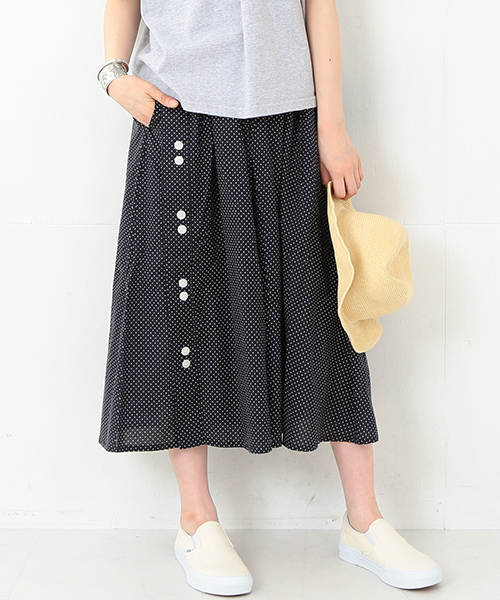 さっぱりとしたコットン素材が心地よいスカート!落ち着いたドット柄がこれからのシーズンにぴったりです。たっぷりのギャザー&贅沢な生地使いで仕立てたスカートはコンパクトなトップスとあわせるとバランスも◎。永くご愛用いただけるひと品です。店舗へお問い合わせの際は下記品番をお伝えください。品番:13-27-0205-867