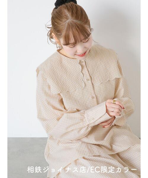 スカラップが施されたビッグカラーが可愛らしいギンガムチェックブラウス。ふんわりとしたボリューム感のあるスリーブも、女性らしい柔らかな雰囲気を演出してくれます。コーディネートに取り入れるだけでも、大人ガーリーなスタイリングが楽しめる1着。同シリーズのスカートとのセットアップが可能です。※商品画像は、撮影環境やお客様のご利用のPC・スマートフォンのモニター環境などにより実物と色味に差異がある場合がございます。
