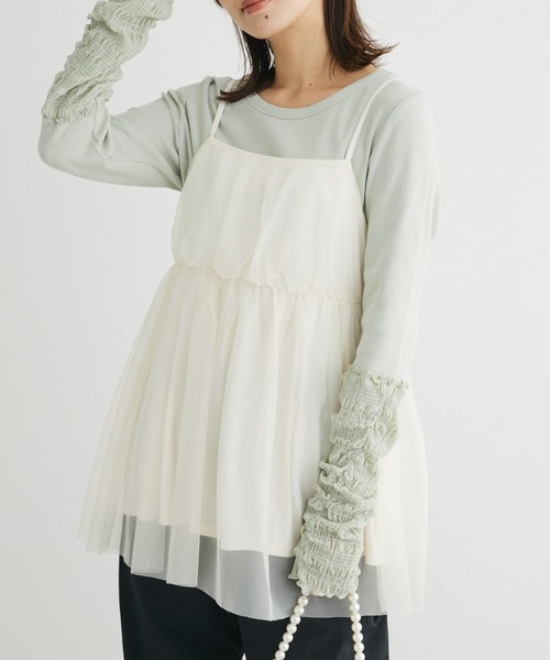 ふんわりとしたチュール素材がフェミニンなムードを演出するキャミビスチェ。ショルダーストラップは細めのデザインになっており、すっきりとした印象を与えます。コーディネートのアクセント使いに大活躍するアイテム◎カットソーやブラウスにレイヤードしたコーディネートがおすすめです。 キャミビスチェ一覧はこちら 透け感[有り] 裏地[すべて有り] 伸縮性[有り] 光沢感[やや有り] 生地の厚さ[薄手] 付属品[無し] ポケット[無し]●製品寸法:F:バスト48cm 着丈67-74cm 裾幅69cm備考: