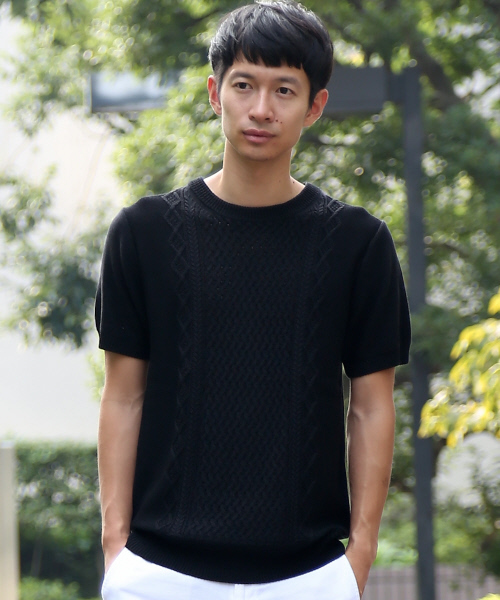 ABAHOUSE 立体感のあるアラン編みで編まれたニットTシャツ。シックな色展開と、シルクの様な光沢感と接触冷感が特徴の糸を使用しており、大人っぽい着こなしのできるアイテムになっております。1枚でも、インナーとしても着て頂けます。 お店にお問い合わせの際には以下品番をお伝え下さい。 品番:0090041017