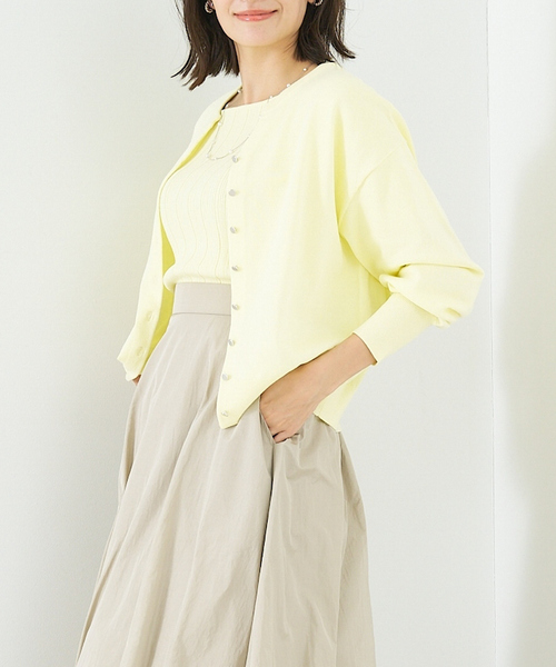 夏まで使えるサラッとカーデ 【Design】 さらっとした麻タッチの糸を使用したカーディガン。キーネックの空きとたくさんついたシルバーの小さな釦がシンプルながらもポイントに。前後着用可能でトップスとしても着られる便利な一枚。 【Fabric】 女性なら夏場まで活躍間違いなしの素材感です。目の細かいニットで上品見えするのでお仕事シーンにもおすすめ。 【Styling】 ボタンを背中にして着ると着丈がよりスッキリするので、ボリュームのあるスカートやワイドパンツにも相性◎同素材のスクエアネックニット(72489040590)とアンサンブルで着用もできます。