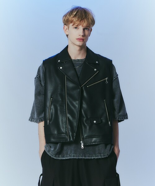 ライダースの袖を切ったような斬新なデザインのベストが登場!【素材】良質感と上品さのあるレザー調素材。軽量でお取り扱いの簡単さが気楽に着用いただけます。※裏地あり【デザイン】ダブルライダースをデザインソースにし、ベスト型に落とし込んだインパクトあるレザーベスト。バイカーなどに愛された伝統的なアイテムを都会的でファッショナブルに仕上がるよう、tk.TAKEO KIKUCHIらしく着やすく落とし込んだ春のライトアウターです。ハードで無骨なデティールをあえて採用し、今年のトレンドにマッチするように仕上げております。※ポケット数:前×4【スタイリング】羽織りとしてお使いいただける一着。真夏以外は着用していただけ、ロングシーズンで活躍してくれます。ハードなスタイルにはもちろんマッチし、キレイめなアイテムと合わせてバランスのとれたスタイリングもオススメです!- BRAND CONCEPT -時代を超えて支持されるトラディショナルなアイテムをベースに、アソビ心とストリートの自由な発想を取り入れ、日本独自のミックススタイルを提案します。【気になる商品はお気に入り登録をおススメ】▼商品のお気に入り登録完売しているカラーの再入荷通知や、ラスト1点、セールの通知をお知らせいたします。▼ブランドのお気に入り登録新商品や再入荷など、いち早くブランドの情報を受け取ることができます。モデル情報:身長181cm B80 W75 H90 着用サイズ:88(FREE)店舗へのお問い合わせ商品番号:170-58305●製品寸法:88(FREE):着丈63cm B125cm 肩幅47cm備考:重量:サンプルサイズ約750g