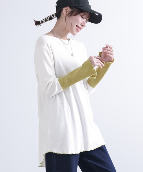 ■デザイン 身頃と袖の配色がお洒落なデザインロンT。 裾と後ろ身頃中心のメロー始末も配色になっていてアクセントに。 後ろ裾はスリット開きになっていて抜け感をプラスします。 ■素材 伸縮性のあるフライス生地で柔らかい着心地のカットソー。袖の配色部分はリブ編みになっています。 薄手の生地感で着こなし次第ではロングシーズン着用可能です。 ■コーディネート 程よくゆるっとしたシルエットなので一枚で着てデニムやタイトめなスカートと合わせてすっきりした着こなしができます。 薄手の生地感なのでインナーとしてのご着用もオススメです。