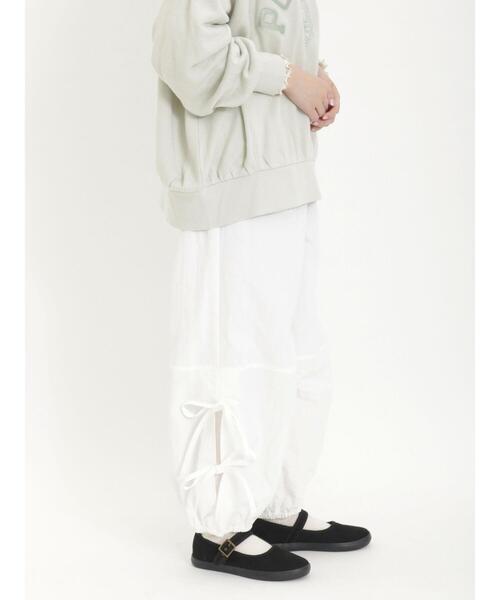 脇スリットとリボンが愛らしさをプラスするパラシュートパンツ。ふっくらとしたボリューム感も女性らしい印象を与えてくれます。ウエストと裾部分はゴムギャザー仕様で心地よくフィットする穿き心地に◎デイリースタイルに是非取り入れたい1着です。※商品画像は、撮影環境やお客様のご利用のPC・スマートフォンのモニター環境などにより実物と色味に差異がある場合がございます。【その他採寸】F ウエスト:[ゴム仕様]66cm 裾幅:[ゴム仕様]15cm