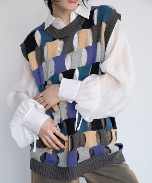 - 2024 VACANCY SPRING COLLECTION - カラフルなブロックカラーがPOPで明るい気持ちなるニットベスト ◆FABRIC 綿素材を含む為、柔らかくサラッとした着心地のニットベスト。 ホールが開いているデザインが、ブロックごとにカラフルにしても 重くなり過ぎず抜け感をだしてカラーを楽しめます。 オーバーサイズにすることによりユニセックスで楽しめ ロングTシャツやシャツなど重ね着もしやすいシルエットです。 POPなカラーのネイビーは、一枚で垢抜けコーデのアクセントになること間違いなし! サンドカラーのチャコールグレーは、トーンをまとめることでシックな印象に。 ◆STYLE 2wayスリーブTシャツ(VCFLE0123003)や歪みロゴ刺繍トップス(VCIZI0224003)と重ねるのにサイズが丁度よく オーバーサイズ合わせてゆったりシルエットもメンズライクでオススメ。 透けるデザインの為、インナーはラメタンクやキャミソール、Tシャツ、ブラウスなど様々に楽しめ 暖かい時期は、薄手にして一枚で存在感を出すのも素敵です◎ ・・・・・・・・・・・・・・・・・・・・ 透け感:なし(穴が大きい為中の衣類は見えます) 裏地:なし 伸縮性:あり 光沢感:なし 生地の厚さ:普通 ・・・・・・・・・・・・・・・・・・・・ 【お買い物をお楽しみいただく為に】 ▼お気に入り登録をオススメ致します▼ ♡をクリックして下さい。 ・《商品のお気に入り登録》で再入荷通知や、ラスト1点の通知、セールの際の通知も受け取ることができます。 ・《ブランドのお気に入り登録》で新作商品や再入荷など、お得な情報を受け取ることができます! 【ATTENTION】 ※画像の商品はサンプルです。 実際の商品と色味、仕様、加工、サイズ、素材等が若干異なる場合がございます。 ※撮影場所やお使いのモニター環境により若干お色味が異なる場合がございます。 ※製品によっては染料の特性上、湿った状態や汗をかいた状態での長時間の放置、または摩擦により、他のものへ色移りする恐れがありますので、着用時にはご注意下さい。 ※お洗濯については商品の洗濯タグ表記をご確認ください。 ※風通しがよく、湿気の少ない日の当たらない場所で保管して下さい。 ※また製品加工上、お手元に届く際に匂いが生じる場合がありますが、 ご使用を続けていく事により匂いは軽減されます。 ※ご注文いただいた予約商品のお届け時期の確認は、注文履歴ページより行えます