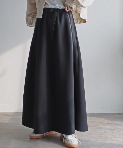 カジュアルにもキレイめにも使い勝手の良い万能ラインスカート-detail-ストンと落ちるシルエットがボディラインを拾わず華奢見え効果抜群。ウエストにはアウトドアアイテムによく使用されるウェビングベルトを採用。落ち感のある素材とフレアシルエットになったAラインのボリュームあるサイジングにより、動きによってスカートの見え方が変化するのもこだわりポイントです。-fabric-ポリエステル×ポリウレタン素材を採用した柔らかな肌に馴染むような着心地。ハリのある表面感でシワになりづらく速乾性にも優れているイージーケア素材。オールシーズンで着られるダンボールニット素材です。-styling-無地カットソーやシャツ、ブラウスなどシンプルなトップスに相性抜群。ローファーなどの革靴にレザーバッグなどのアイテムとの組み合わせで大人コーデにも使いやすい素材感です。ショート丈のトップスやアウターとのコーデもおすすめです。レディースモデル身長:162cm モデル着用サイズM