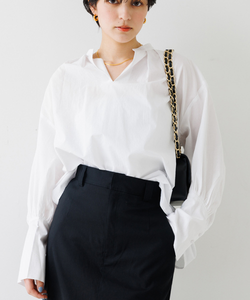 長めのカフスと袖のボリュームの出し方が特徴のブラウス。春から夏かけてこの先長く着られる優秀アイテム。袖のボリュームが目を惹くブラウスは、やや張りのある生地感とたっぷりギャザーが効いたデザインがマッチして、風をはらんでシルエットがチャーミングに。オーバーでリラックスしたラインのシルエットを楽しんだり、インして袖のデザインを強調したシルエットもモダンな雰囲気で大人に。いつものスタイリングをアップデートする、主役のブラウス。【注意事項】※商品画像は、光の当たり具合やパソコンなどの閲覧環境により、実際の色味と異なって見える場合がございます。あらかじめご了承ください。※画像の商品はサンプルです。実際の商品と仕様、加工が若干異なる場合があります。※サイズ表記はあくまで目安となります。※その他の予約商品、通常商品との同時決済はできません。※入荷状況により、お届け予定が前後する場合があります。※お客様への発送が店頭販売より遅れる場合もあります。※追加生産商品は、一部の店舗、通販で販売中の場合がございます。予めご了承下さい。※商品を使用前に、タグ等に記載されている「取り扱い上の注意書き」「洗濯表示」を必ずご確認ください。※商品に不良が無い場合、包装紙および箱の彼損がございましても発送いたします。あらかじめご了承ください。