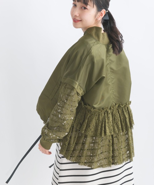 女性らしさのあるレースドッキングブルゾン 本体は、耐久性があり軽量で型崩れがしにくいナイロン100%の生地が使用されており、 袖やバックの切替え部分には繊細なレース生地がドッキングされたデザインブルゾンです。 バックはギャザーや2段フリルデザインがプラスされ、 カジュアルなアイテムですが、女性らしい着こなしが叶います。 また、袖はアームホールのファスナーで取り外しが可能となっているので、 コーデに合わせてベストとしても楽しめます。 ラウンドヘムラインになってるので、さっと羽織るだけでも様になりますが、 裾のドロストを絞ってより立体感を出した着こなしも出来ます。 【詳細情報】 厚み:□薄手 ■ふつう □厚手 透け感: ■なし ■あり(レース部分) 光沢感: □なし ■あり 伸縮性: ■なし □あり 裏地: ■なし □あり ポケット:□なし ■あり 重量: 約380g ※撮影場所や明るさにより 実際の商品と色味が若干異なる場合がございます。 ☆商品のお気に入り♡登録を押せば ”再入荷通知”や”残りわずか通知” 値下げのお知らせが届きます! お気に入りのブランド登録していただければ新商品入荷のお知らせも届きますので 是非登録してみて下さい。