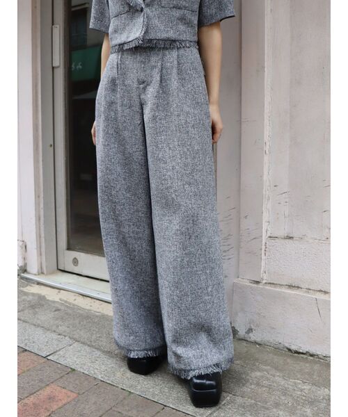 ■セットアップITEM >>ハーフスリーブフリンジジャケットサマーツイード素材のワイドストレートパンツです。ツイードならではのフリンジデザインを裾に施しているデザインです。薄手の清涼感のある素材を使用しているため、春夏でも着やすい一枚です。同素材でジャケットとスカートの展開もございます。