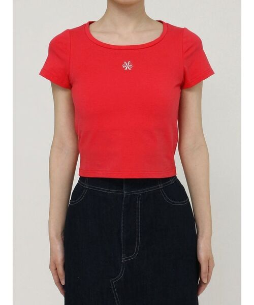 胸元にワンポイントのミニモノグラムを刺繍したオリジナルロゴTee。 MERCURYDUOのMを、丸みのある女性らしいフラワーモチーフに落とし込んだオリジナルモノグラムがポイントです。 抜け感のある広めなネックラインにコンパクトでシンプルなシルエットが、鎖骨をスッキリ綺麗に魅せ、細見えを叶えてくれます。 ぷくっと膨れたような立体感のあるワンポイント刺繍もこだわりポイントです。 シルケット風加工を施したなめらかな表面感なので、カジュアルすぎず、キレイめコーデに合わせやすいです。 ▼スタイリング コンパクトな丈感なので、華やかなフラワープリントのスカートと合わせてフェミニンカジュアルに着こなすのが◎ ▼サンプル修正箇所 ※モデル着用は全てサンプルです。 ※ブラックの刺繍はホワイトに変更になります。
