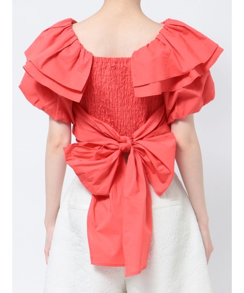 カラー展開がかわいいバルーンスリーブのラッフルブラウス。バックで結ぶビッグリボンがトレンド感満載のアイテム。後ろはシャーリングゴムなので、楽に着用することができ、リボンを結んで自分のサイズに結ぶことができます。2段のフリルが二の腕周りと肩周りを華奢に見せてくれます。オンショル、オフショルの2WAYで着用が可能です。▼スタイリング ボリュームのあるシルエットなので、ボトムはスッキリとしたアイテムで引き算をして垢抜けスタイリングに◎ジャガードのショートパンツ合わせでミニマルな夏の雰囲気を演出するコーディネートや、シアーのパンツやデニム合わせでフェミニンカジュアルコーディネートも◎※着丈はサンプルから3㎝長くなります。