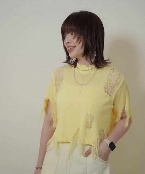 【商品紹介】ゆったりとしたルーズな身幅ながら、すっきりとした丈感がレイヤードにも向いているニットです。インパクトのある穴あきのデザインがコーディネートのポイントに◎ワンピースや、パンツ・スカートと、ボトムスを選ばずに着用いただけます。<ディテール>・ダメージデザイン・クロップド丈・クルーネックデザイン【マテリアル】暑い時期にも快適なドライタッチのニット素材を使用しています。・厚み/薄手・透け感/あり・裏地/なし・伸縮性/あり【お取り扱い上の御注意】<お届け時のシワにつきまして>ページで着用している商品は撮影前に全てプレスをかけております。その為お送りする商品は畳みジワや細かいシワがついている場合がございます。ご了承下さいませ。<色移り・色落ちについてのご注意点>この製品は配色になっているため、下記の点にご注意ください。 ・色泣きを防ぐ為、つけ置き洗いや雨や汗で濡れたままの放置は避け、速やかに処理(脱水・乾燥)をしてください。・濃色部分は摩擦(特に湿った状態での摩擦)により、他の衣料や下着バッグ等(特に白)に色移りすることがございますのでご注意ください。ネット使用 もみ洗い禁止 あて布使用 着用中の摩擦や洗浄等により毛羽立ちやピリング(毛玉)が発生することがあります。 毛羽立ちやピリングが発生した場合は、ブラシ、毛玉取り器、 ハサミ等を状況に合わせて使いわけ早めに丁寧に取り除いて下さい。 着用の際はバッグやその他のかたいもの等との摩擦にご注意下さい。 風合いを損なわないためにも連続着用はおさけ下さい。 先の尖ったものやざらついたものに引っ掛けた場合、糸が飛び出すことがあります。 アクセサリー、ベルト、バッグ等には十分ご注意下さい。 自重伸びや外観変化を防ぐためハンガー等に吊り下げての保管はさけ、 軽く折りたたんだ状態で圧力が加わらないように保管して下さい。 濃色は湿摩擦により色が移る場合があります。 雨や汗等の湿った状態での摩擦や他の衣類との組み合わせ及びバッグ等の持ちものにもご注意下さい。 洗浄後は形を整えて乾燥 ●染料や加工を加えた際の臭いが製品に付着している場合がございます。臭いが気になる場合には、風通しの良い日陰の場所に干して頂けましたら幸いです。