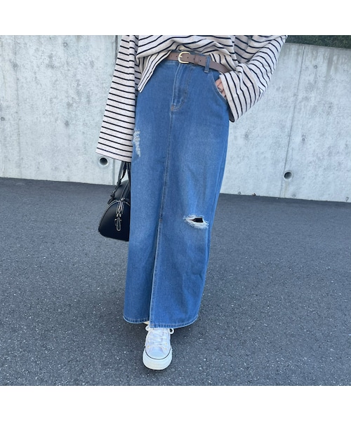 さりげないダメージ加工が抜け感のある大人っぽさを演出してくれるデニムロングスカート。 柔らかいデニム素材で着心地もよく、前スリットで足さばきも良く、歩くと足首がチラ見えするのも抜け感のポイント◎ オールシーズン着回し頂けるアイテムです。 ※モデル身長:161㎝ ▪️クリックポストにて代引きをお選び頂いた方は、400円プラスさせていただき、宅配便代引きにて発送させていただきますのでご了承下さい。 ▪️カラー ブルー ▪️サイズ M 総丈(前中心)92cm 総丈(脇)95cm 総丈(後中心)94cm ウエスト69〜77cm ヒップ94cm 裾幅54.5cm 前スリット37cm ジッパー13cm ※多少の誤差は予めご了承ください。 ▪️素材 綿 60% レーヨン 27% ポリエステル 13%
