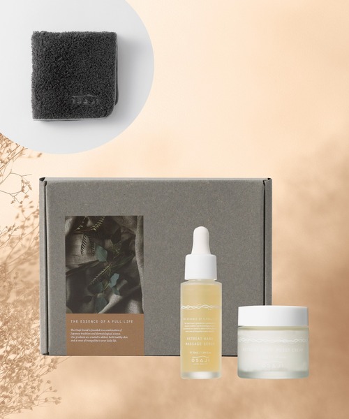 OSAJIのベストセラーアイテムとしてZOZOCOSME限定のリトリートハンドセットが登場! なめらかな手肌へ導くハンド美容液と、濃厚高保湿のモイストハンドクリーム、OSAJIロゴ入りのハンドタオルをZOZOCOSME限定デザインの特別なギフトボックスに入れてお届けします。 大切な方へのプレゼントにも、自分へのご褒美にもおすすめです。 セット内容 ・リトリート ハンド マッサージ セラム 30mL ・リトリート ハンド モイスト クリーム 50g ・ハンドタオル(非売品) ラッピングした状態でお届けいたします。 ■リトリート ハンド マッサージ セラム 30mL ・マッサージして血行促進をするだけでなく、とことん保湿も出来るハンドセラム ・⼿元をきちんといたわり、 寝ている間にスキンケア同様、集中ケアして休ませる時間を作るハンドケア ・手のマッサージでリラックスタイムに・毎晩つけたくなるような⾹りとストレスのないテクスチャ [使用方法] ①お休み前にスポイトで適量を手に取り、やさしく指先までマッサージしながら伸ばし、馴染ませます。 ②滑りが悪くなったらマッサージ終了の合図です。乾燥を感じる場合や、物⾜りない時は、多めにとりお使いください。 リトリートハンドモイストクリームを重ねて使うと、うるおいを閉じ込める効果が増し、より一層しなやかな手元に仕上がります。 香りについて アオモジ、ラベンダー、ゼラニウムの⼼地よくやさしい⾹り ※植物由来原料を使用しているため、製品単位によって色や香りが異なる場合があります。 ■リトリート ハンド モイスト クリーム 50g (ハンドクリーム/保湿クリーム) ・⼿元をきちんといたわり、 寝ている間にスキンケア同様、集中ケアして休ませる時間を作るハンドケア ・濃厚なテクスチャでありながら、塗り伸ばすとピタリと密着しとことん保湿 ・毎晩つけたくなるような⾹りとストレスのないテクスチャ [使用方法] 夜、お休み前にハンド マッサージ セラムでマッサージした後、あずき粒⼤を⼿に取りお使いください。 マッサージセラムをお使いいただいた後だと、すべりが良くなるので少量で気持ちよく伸びます。 乾燥により、物⾜りないと感じる時は多めにお使いください。もちろん⽇中もお使い頂けます。 香りについて アオモジ、ラベンダー、ゼラニウムの⼼地よくやさしい⾹り ※植物由来原料を使用しているため、製品単位によって色や香りが異なる場合があります。 ■ハンドタオル(非売品) グレーカラーのシンプルなハンドタオルは、OSAJIのロゴ入りデザイン。 ■ギフトボックス(Sサイズ) ZOZOCOSME限定デザインの特別仕様。