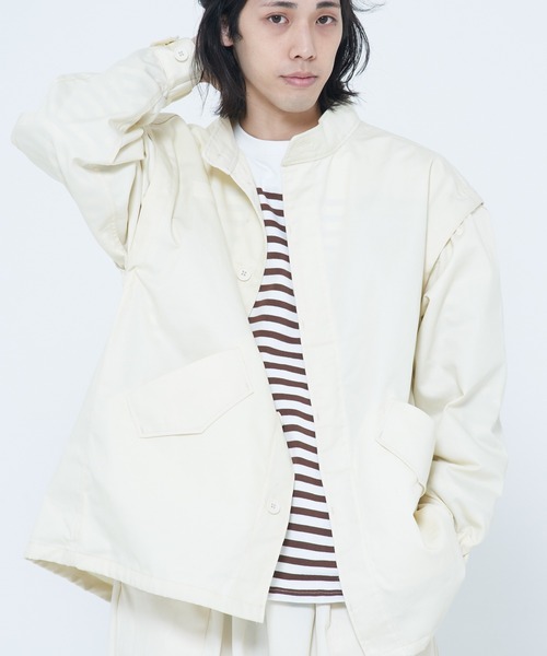 ≪ジャケットにもベストにもなる2WAYアイテム≫ -------------------- ■袖の脱着が可能なジャケットにもベストにもなる2WAYアイテムの登場! 気温や好みで雰囲気を変えられます。ボタンでの取り付けなので袖の着脱も簡単。 たっぷりとしたややオーバーサイズの作り。肌寒い日にはインナーに厚手のものを入れられるので重ね着もしやすいです。無地アウターなので柄モノやプリントTシャツなどにもぴったり。 ■ややハリのあるツイル生地にスタンドネックとフィッシュテールでミリタリージャケットらしさを十分楽しめるアイテム。動きのあるフィッシュテールのバックスタイルを楽しむのも、ドローコードを絞ってシルエットに変化を付けるのも◎ ■ベーシックカラーで揃えたアイボリー/ブラック/カーキ/ネイビー/ベージュの5色展開。 ミリタリー感を楽しめるカーキやブラックは定番のカッコよさでどんなアイテムとも相性◎ネイビーは普段使いしやすく大人のカジュアルコーデにもぴったり。アイボリーやベージュはレディースアイテムとも相性の良い淡い色味。レースのアイテムやスカートやショートパンツなどと合わせても可愛いです♪ -------------------- *2WAY *ミリタリー *ライトアウター *無地アウター *春アウター *ベスト *メンズライク *男女兼用