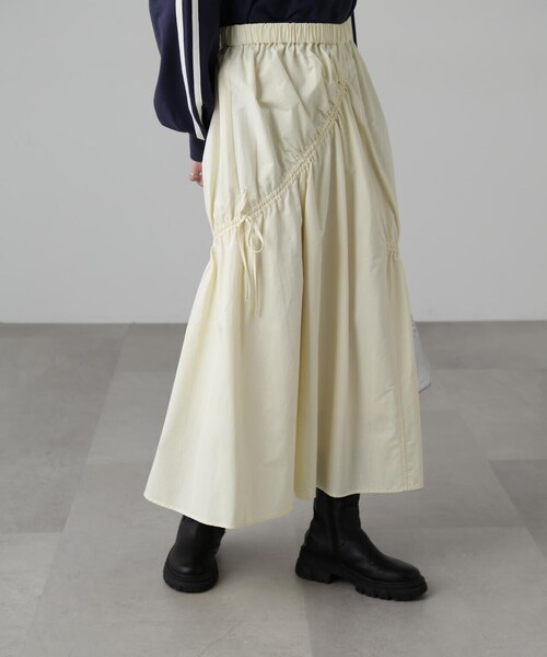 ドロストから生まれるギャザーを活かしたフレアーマキシスカートの登場です。 コットンナイロン素材で、張りのある生地を使用しています。前身から後ろ身につながったラインのドロストで、脇にリボンがくるようにしているのがポイントです。アシンメトリーにラインを配置しているのでアンバランスですが、バランスは取れるよう調整しています。トップスがベーシックでもスカートで遊びがあるので完成されたスタイルになります。■透け感:なし■生地の厚さ:普通■裏地:あり■伸縮性:なし■光沢:ややあり■シルエット:スタンダードmodel:骨格ウェーブ---------------------------------------------------◆商品のお気に入り登録◆お気に入りアイテムの値下げ・再入荷・在庫1点などの通知を受け取ることができます。◆ブランドのお気に入り登録◆新商品や再入荷、セール、クーポン配布などお得な情報を受け取ることができます。---------------------------------------------------※ご注文いただいた予約商品のお届け時期の確認は、注文履歴ページより行えます。
