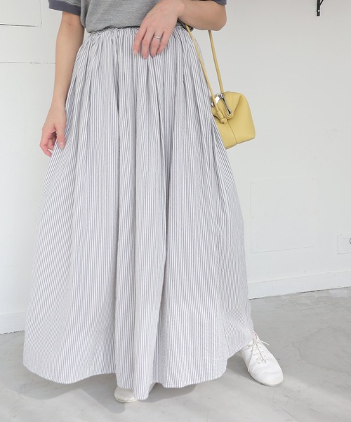 ブラウスとシリーズ展開のギャザースカート。 コットン素材でナチュラルな雰囲気漂います。 ふんわりとしたボリューム感のあるシルエットが魅力的。 同素材のブラウスとのセットアップでの着こなしで、ナチュラルな春の装いが完成します。 ロンTやスウェットなどのカジュアルなアイテムとも相性抜群◎ シンプルなデザインでベーシックに着回しやすい1枚です。 着丈の異なる2サイズ展開で、身長に合わせてお好みの丈感をお選びいただけます。 ウエストは一周ゴム仕様でストレスフリーに穿いていただけます。 サイドポケット付きで実用性も◎ 柔らかくナチュラルな肌触りのコットン100%。 裾まで裏地付きなので安心して穿いていただけます。 - - - - - - - - - - - - - - - - - - - - - - - - - - - - - - - - - 透け感:なし 裏地:あり 伸縮性:なし 光沢感:なし - - - - - - - - - - - - - - - - - - - - - - - - - - - - - - - - - ※ 撮影時の照明などの環境と、モニターに表示される色味がメーカーにより変わってしまう等の理由により、実際にお届けする商品と、ご覧になられているアイテムの色が若干異なる場合がございます。ご了承下さいませ。