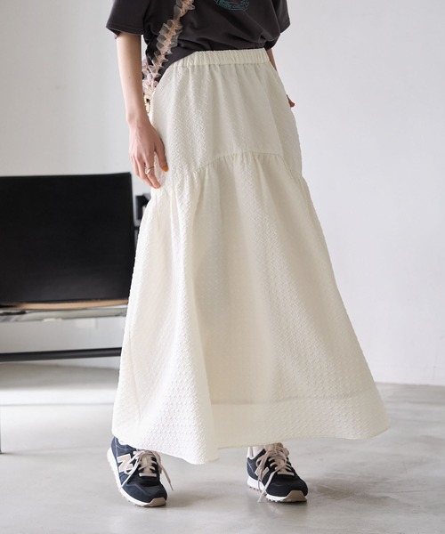 カジュアルでも女性らしさを損なわないスカート。【デザイン・シルエット】 ・独特の表面感を持つ、膨れジャカードを用いたロングスカート。 ・ウエストギャザーで快適性は抜群。 ・個性的な切り替えによる、計算されたシルエットもポイント。 【カラー】 ・ブラック、ホワイト、カーキのすっきりとした3色を展開。 【スタイリングポイント】 ・トップスはシンプルなカットソーやシャツを合わせて、スカートを主役に。 ・足もとはスニーカーやフラットシューズで、リラクシーに仕上げて。 ----------------------------- 裏地:あり 透け感:なし 伸縮性:なし 生地感・厚さ:普通 ポケット:あり ウエスト:ゴム 季節:通年 ----------------------------- ※撮影時の光、お使いのモニター環境によって色の見え方が違う場合がございます。 ※モデル身長:166cm 着用サイズ:38