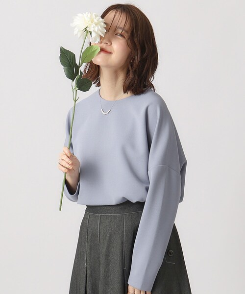【デザイン】クルーネックのシンプルデザインなので、オンでもオフでも着まわせるトップスです。カジュアルな雰囲気もあるドロップショルダーですが、きれいめな素材感を仕様したことでで、きちんと感をプラスしました。【スタイリング】センタープレス入りのワイドパンツやテーパードパンツと合わせていただくと、すっきりとしたオフィスカジュアルスタイルにマッチします。フレアシルエットのスカートと合わせていただくと、フェミニンで上品な印象で着ていただけます。落ち感のあるゆるシルエットのワイドパンツを合わせた、デイリーコーデもおすすめです。【素材】ダンボール組織のジョーゼット織で仕上げ、寒さが残る時期にも程よい肉感ときれい目で繊細な表面感を両立。ダンボール素材なので気になる着ぶくれも抑えてくれます。伸縮性を持たせたジャージ素材なので、リラクシーな着心地。モデル情報:身長166cm B81 W57 H86 着用サイズ:02(M)店舗へのお問い合わせ商品番号:741-18314●製品寸法:02(M):着丈59cm B130cm 袖丈39cm 肩幅70cm03(L):着丈61cm B138cm 袖丈40cm 肩幅71cm04(LL):着丈63cm B146cm 袖丈41cm 肩幅72cm備考: