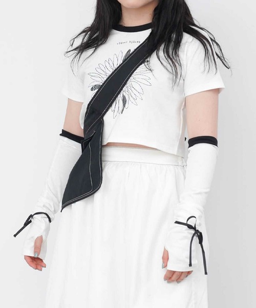 【商品紹介】アームカバーとショート丈のTシャツがセットになっています。Tシャツのプリントはemuemuさんのオリジナル柄で、ひび割れプリントがこだわりのデザイン。衿とアームカバーの袖口は配色になっていて目を引きます。アームカバーの袖口部分にリボンが付いているので、結べばサイズ調整も可能です。<ディティール>・ショート丈・アームカバーにフィンガーホール付・フロントひび割れプリント【マテリアル】さらりとしたタッチのコットン100%素材です。 洗濯機使用OK。 ・厚み/薄手 ・透け感/オフホワイト:ややあり。カーキ:なし ・裏地/なし ・伸縮性/あり【お取り扱い上の御注意】<お届け時のシワにつきまして>ページで着用している商品は撮影前に全てプレスをかけております。その為お送りする商品は畳みジワや細かいシワがついている場合がございます。ご了承下さいませ。<色移り・色落ちについてのご注意点>この商品は摩擦(特に湿った状態での摩擦)や汗や雨などでぬれた時は他の衣料や下着に色が移る事がありますので、十分ご注意ください。ネット使用蛍光増白剤使用禁止。 つけ置きや濡れたままの放置禁止。着用中の摩擦や洗浄等で毛羽立ち、濃色は白くなることがあります。部分的にもみ洗いやしみ抜き等を行うとその部分が白くなります。化粧品や汗、水等により色落ちやしみが発生することがあります。しみや汚れが付着した場合は早めにクリーニング店にご相談下さい。直射日光や蛍光灯による変色にご注意下さい。 同系色で洗浄して下さい。色差が出る恐れがありますので、本体・アームカバーは同時に洗浄ください。 この製品は配色になっているため、下記の点にご注意ください。・色泣きを防ぐ為、つけ置き洗いや雨や汗で濡れたままの放置は避け、速やかに処理(脱水・乾燥)をしてください。 ・濃色部分は摩擦(特に湿った状態での摩擦)により、他の衣料や下着バッグ等(特に白)に色移りすることがございますのでご注意ください。●染料や加工を加えた際の臭いが製品に付着している場合がございます。臭いが気になる場合には、風通しの良い日陰の場所に干して頂けましたら幸いです。