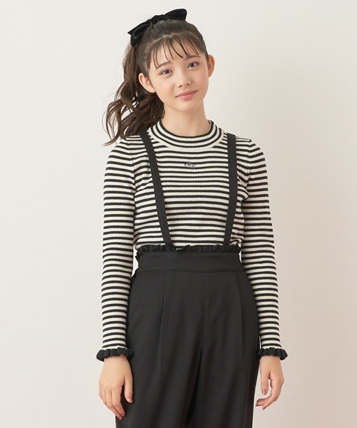 やわらかくなめらかなタッチの糸を使用したボーダーリブニットです。シンプルなデザインながら胸元のロゴ刺しゅうや袖先のフリルでさりげない可愛らしさを演出。 吊りつきパンツやジャンスカなどのインナーに大活躍するアイテムです。 刺しゅうの裏に「あて布」はございません。 【透け感】透けない 【生地の厚さ】普通 【伸縮性】あり 【裏地】なし 【ポケット】なし ※こちらは2024年福袋の単品販売商品となります。