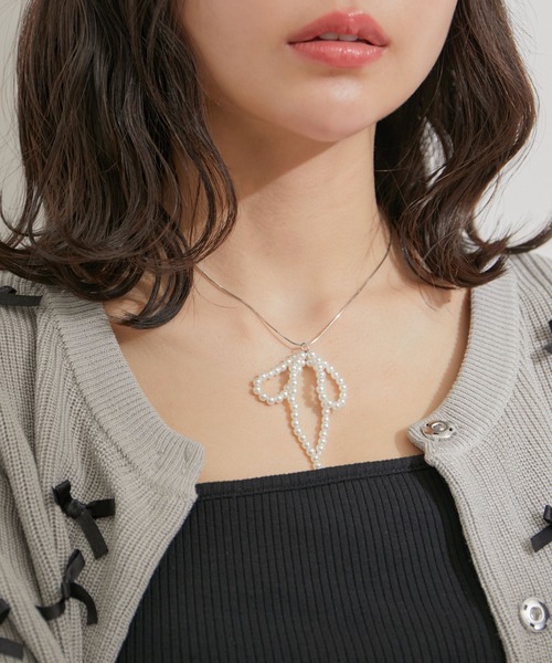 パールリボンが可愛らしいショートネックレス。◆2024春夏◆ 【デザイン・シルエット】 クタッと下を向くパールリボンが可愛いネックレス。 細いスクエアスネークチェーンがリボンとマッチして、シンプルなお洋服にはもちろん、ショートネックレスなどと合わせてカジュアルにごちゃっとつけて頂くのもおすすめです。 【素材】 真鍮 アクリル ※画像の商品はサンプルです。 実際の商品と仕様、加工、サイズが若干異なる場合がございます。