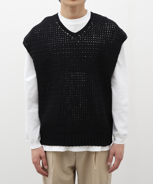 手編みのニットベスト。ハンドニットならではのざっくりとした編み地が魅力です。ゆったりとしたシルエットとざっくりとした編地、素材が相まって清涼感のある一着に仕上がっています。【ご注意】※照明の関係により、実際よりも色味が違って見える場合があります。またパソコン・スマートフォンなどの環境により、若干製品と画像のカラーが異なる場合もございます。※商品の色味は、商品アップ画像をご参照ください。モデルサイズ:身長:179cm 着用サイズ:フリー本体:ドライクリーニング