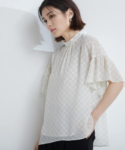 TIARAではベーシックなプリントブラウス。ドロップした肩にフリルの袖が付いているので、肩幅を強調せずに、女性らしい華奢な雰囲気になります。素材が繊細で透け感があるので、清潔感もありデイリーはもちろん、お仕事にもぴったりです。インナーキャミ付き