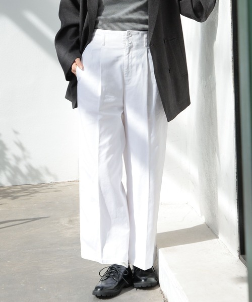 ■素材■太さの糸をしっかりと打ち込んだ定番のコットンツイル生地です。適度なハリ感と綿の柔らかな風合いで穿き心地の良い素材感に仕上げています。■デザイン■フロントには深めのタックをいれて立体的なシルエットにしたワイドパンツです。センタープレスを入れることでカジュアル過ぎない印象に仕上げました。ハイウエストデザインなので足長効果も抜群です。■デザイン■甘めブラウスとのスタイリングがおすすめです。ボーダーのカットソーで大人カジュアルに着こなしていただいても○