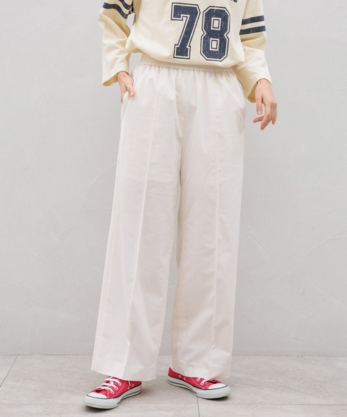 ストレスフリーで穿けるきれいめパンツ! ■素材■ 特殊紡績した糸を使用して、クリアな表面感とドライタッチの風合いが特徴の生地です。 ストレッチ入りで穿きやすい素材になります。 ■デザイン■ ウエストのゴムシャーリングデザインがポイント。 太すぎないワイドシルエットでバランスがとりやすく、トップスを選ばず着用していただけます。 ウエストがゴムなので楽に着用いただけますが、素材やデザインにこだわりラフすぎない印象に仕上げています。 ■スタイリング■ カーデやシャツを羽織って、ウエストのシャーリングを見せて履いていただくのがおすすめ。 程よいワイドシルエットとハイウエストデザインでスタイルUPが叶う一着になります。