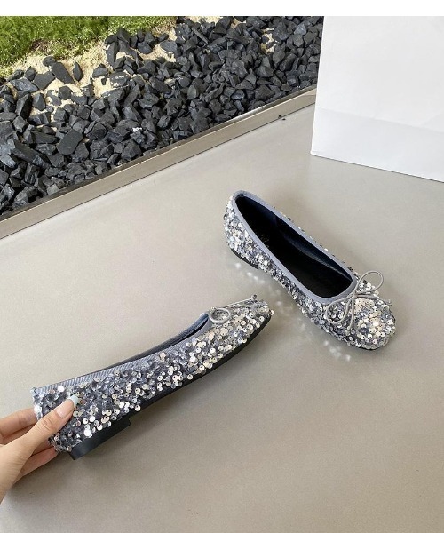 ◆POINT◇ 一味違うバレエシューズで足元に遊び心を♡ 今季注目のスパンコールで足元をぐっと華やかに。 カラーはベーシックなブラックと差し色のシルバーの2色。 小物のスパンコールはアクセントとしていつものコーデに投入しやすく、 履くだけでおめかしムードも一気に急上昇です♡ ソフトな履き口と柔らかいインソールで、 足裏への衝撃を軽減し、足が痛くなりにくい一足。 【2色展開】ブラック/シルバー ーーーーーーーーーーー ヒールの高さ:約1.3cm 片足重量:約149g 素材:合成皮革 ーーーーーーーーーーー ※着用身長によって画像イメージと異なる場合があります。 ※撮影環境により、実際のカラー、形状、デザイン等多少異なる場合がございます。 ・パンプス ・リボン ・スクウェアトゥ ・ローヒール ・フラットシューズ ・スパンコール ・キラキラ ・トレンド ・ロングシーズン ・バレエコア 《 お知らせ 》 ▼商品のお気に入り登録お気に入りアイテムの値下げ・再入荷・在庫1点などの通知を受け取ることができます。 ▼ブランドのお気に入り登録新商品や再入荷、セール、クーポン配布などお得な情報を受け取ることができます。 是非、お気に入り登録してみてください?